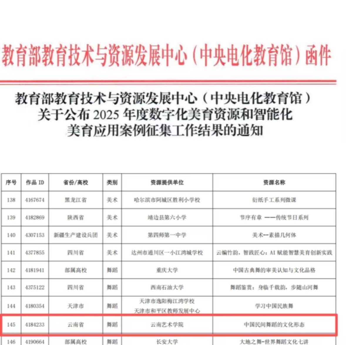 近日,征集后的评审结果正式公布,云南艺术学院共有7项成果成功入选,其中舞蹈学院刘丽院长的《中国民间舞蹈的文化形态》入选“艺术技能资源”类别,后续将上线至国家中小学智慧教育平台美育频道,面向全国广大师生开放共享、学习借鉴。